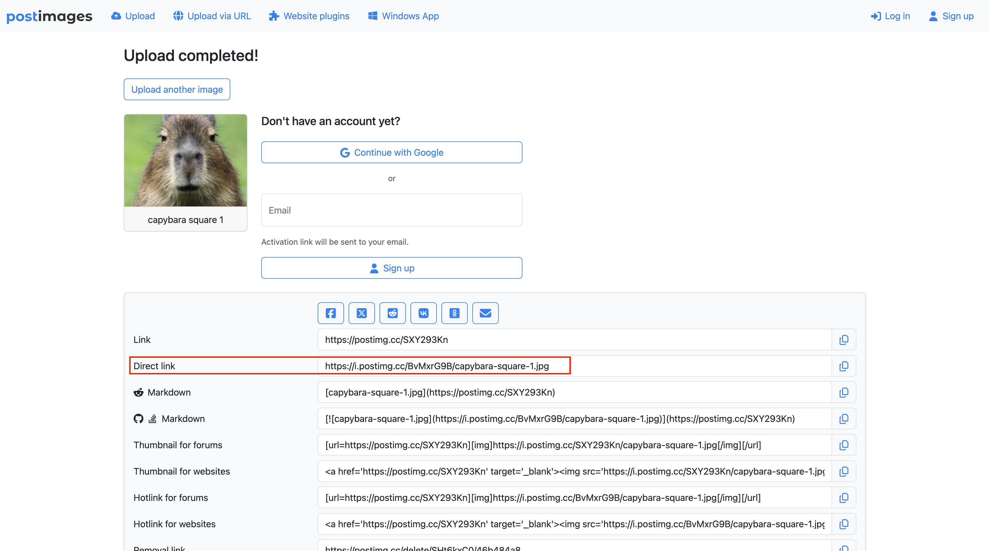 To send images through Email Site Members, go to one of the many free image hosting services that allow you to copy and paste an image link, such as https://postimages.org/. Following is an example using PostImages.org.