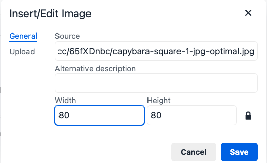 - Under General > Source, paste the Direct Link and set Width and Height in pixels. SAVE.